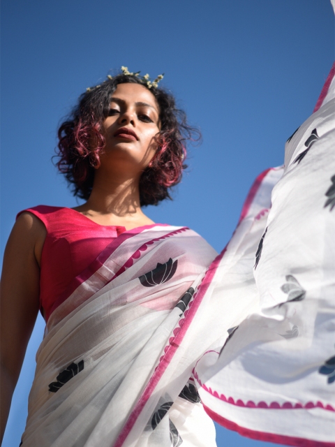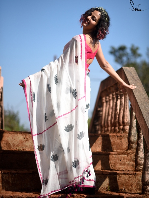 This charming White color saree’s drape is 5.5 meters long. The Saree does not come with a readymade blouse as donned by the model in the picture; But can be purchased separately from Suta.
