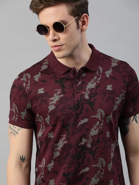Maroon and Grey printed T-shirt, has a polo collar, and short sleeves