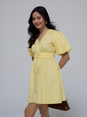 Twenty Dresses by Nykaa Fashion Lemon Yellow V Neck Balloon Sleeves Midriff Gathered Mini Dress