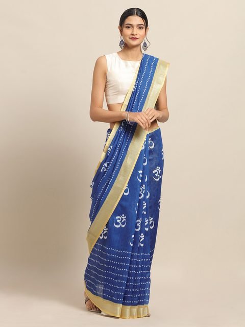 Blue and White bandhani kalamkariĀ printed saree and has a zari border