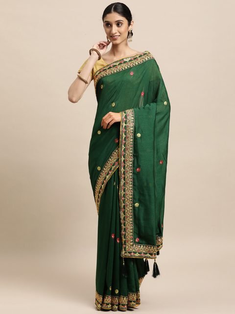 - Green and gold-toned saree
