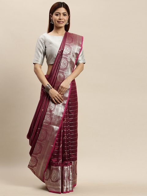 Maroon and Silver-toned banarasi striped saree and has a woven design border