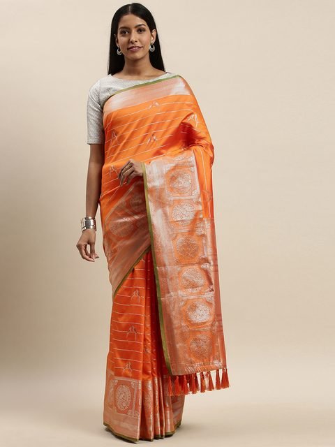 Update your wardrobe staples with this exquisite traditional saree from VASTRANAND. Match this orange design with caged heels and statement jewellery when you have a event to attend.