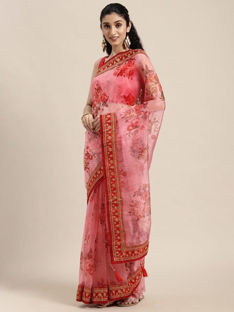 - Floral printed saree with embroidered border