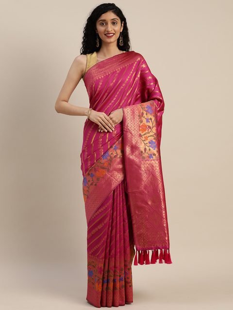 Pink and Gold-toned banarasi striped saree and has a woven design border