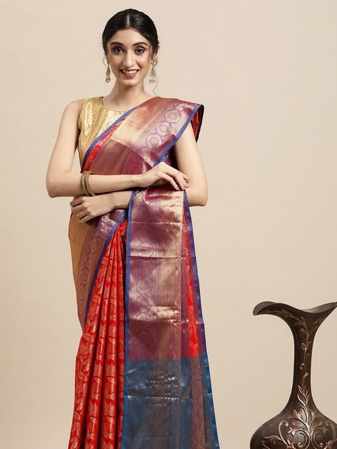 • Red and gold-toned kanjeevaram saree