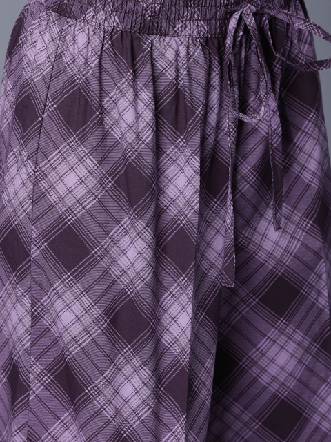 Purple and black Checked palazzos, has elasticated waistband, drawstring closure