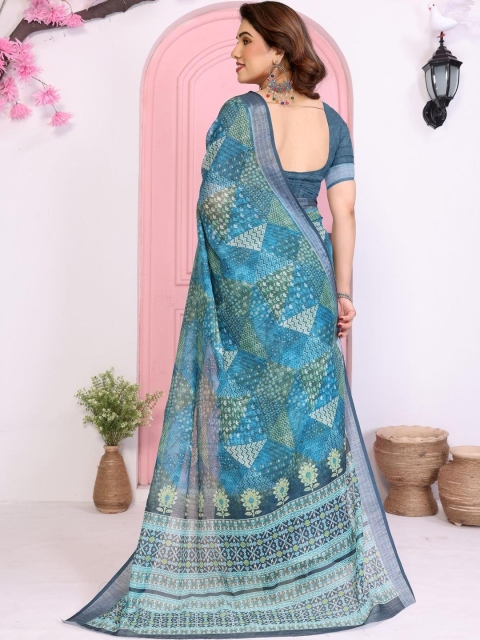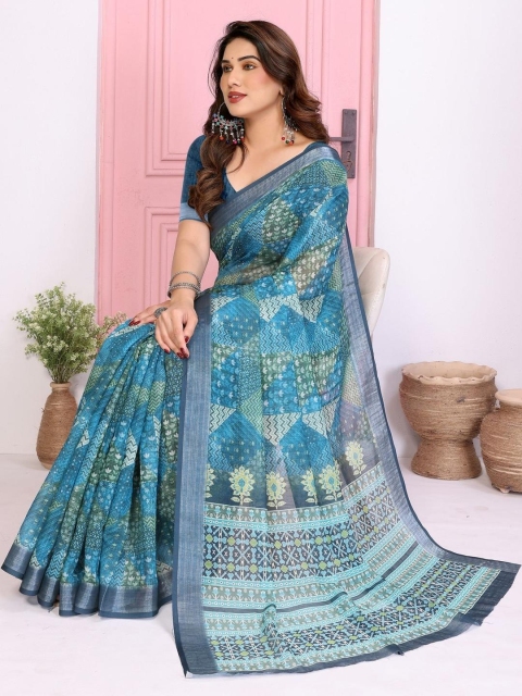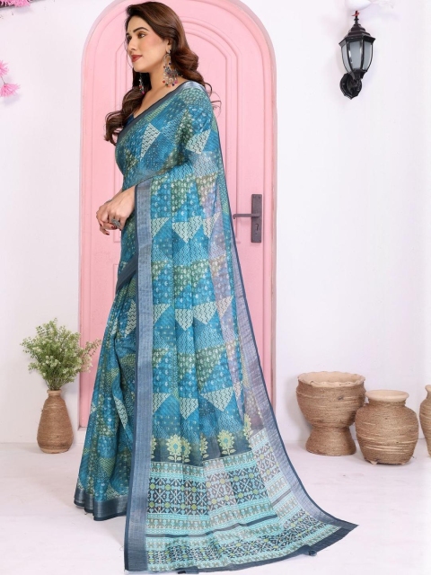 Mandara fashion Green Linen Blend Printed Sarees