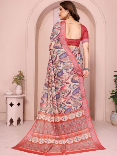 Mandara fashion Red Linen Blend Printed Sarees