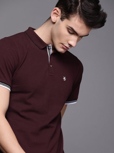 Burgundy solid T-shirt, has a polo collar, and short sleeves