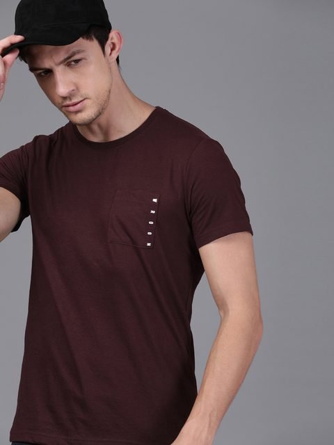 Burgundy solid T-shirt, has a round neck, short sleeves, and 1 pockets